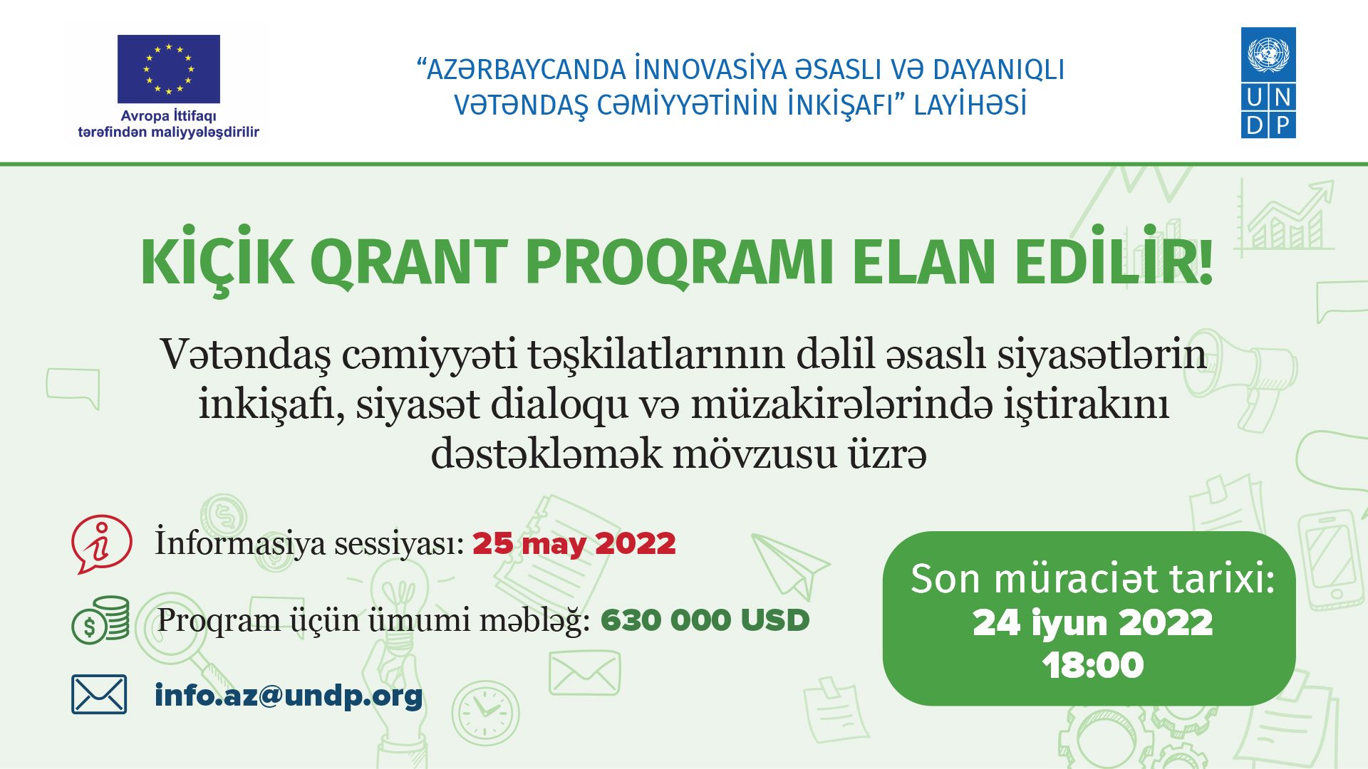 Kiçik qrant proqramları, Aİ-nin maliyyələşdirdiyi və BMTİP-nin həyata keçirdiyi “Azərbaycanda innovasiya əsaslı və dayanıqlı vətəndaş cəmiyyətinin inkişafı” layihəsi tərəfindən təşkil edilir.