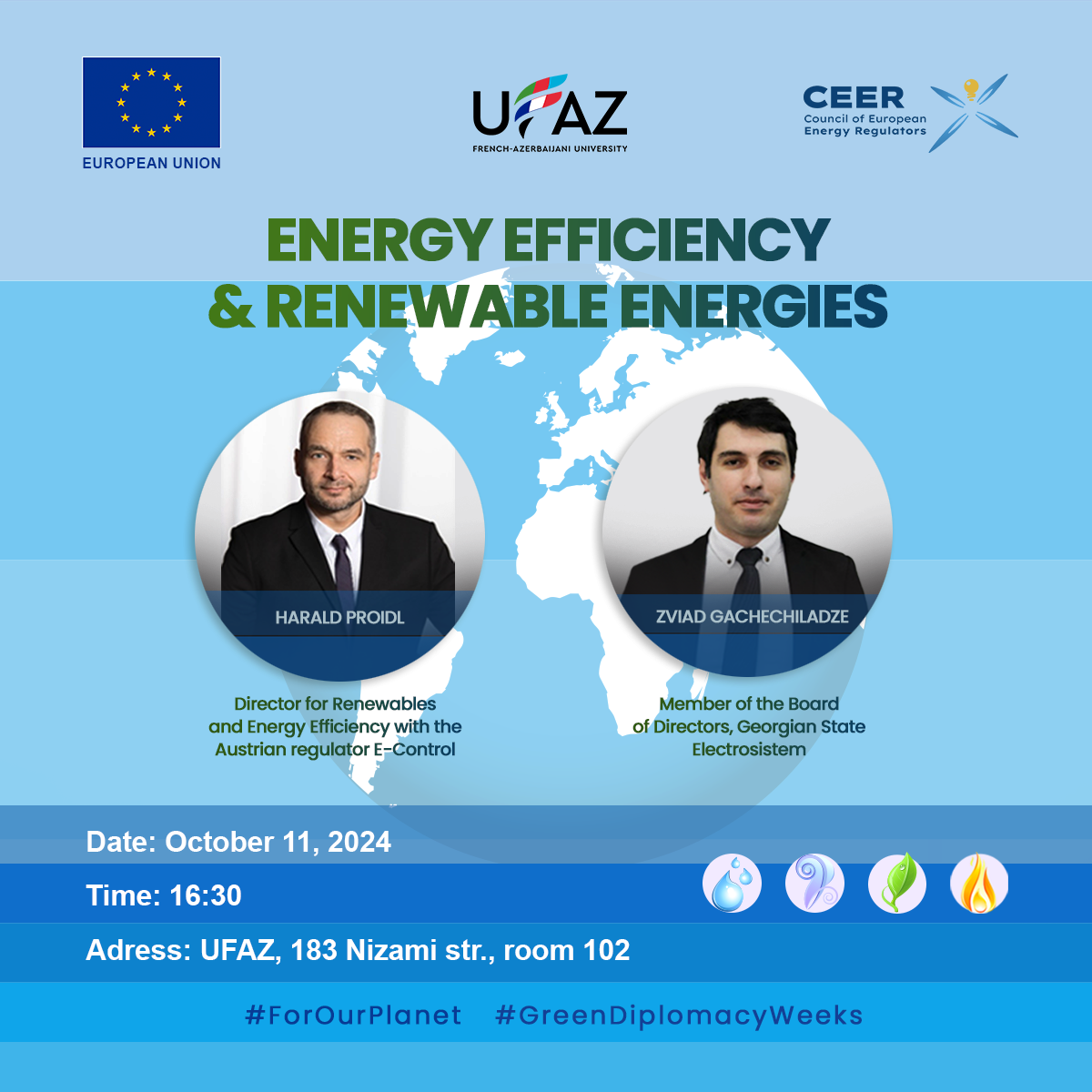 On October 11th, as part of the European Union’s #ForOurPlanet campaign, EU4Energy experts hold an event at the French-Azerbaijani University (UFAZ) on “Energy Efficiency and Renewable Energies.” The goal of this event is to provide students with in-depth information on topics such as energy sharing, energy communities, and energy transition processes.